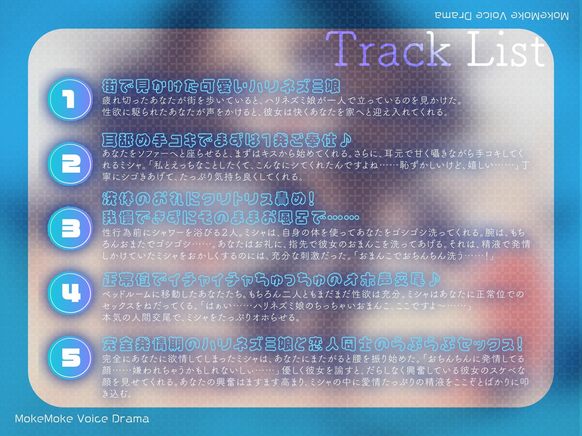 疲れ切ったあなたが街を歩いていると、ち〇ちゃくて可愛いハリネズミ娘を見つけた。彼女は友達と待ち合わせをしていると言うが、もちろんそんなことは関係ない。あなたが癒しをお願いすると、彼女は快くあなたを家へと招き入れてくれた。純真で抜けてて、それでいて本当はドスケベな半獣・ミシャと、たっぷりあまあまオホ声えっち!