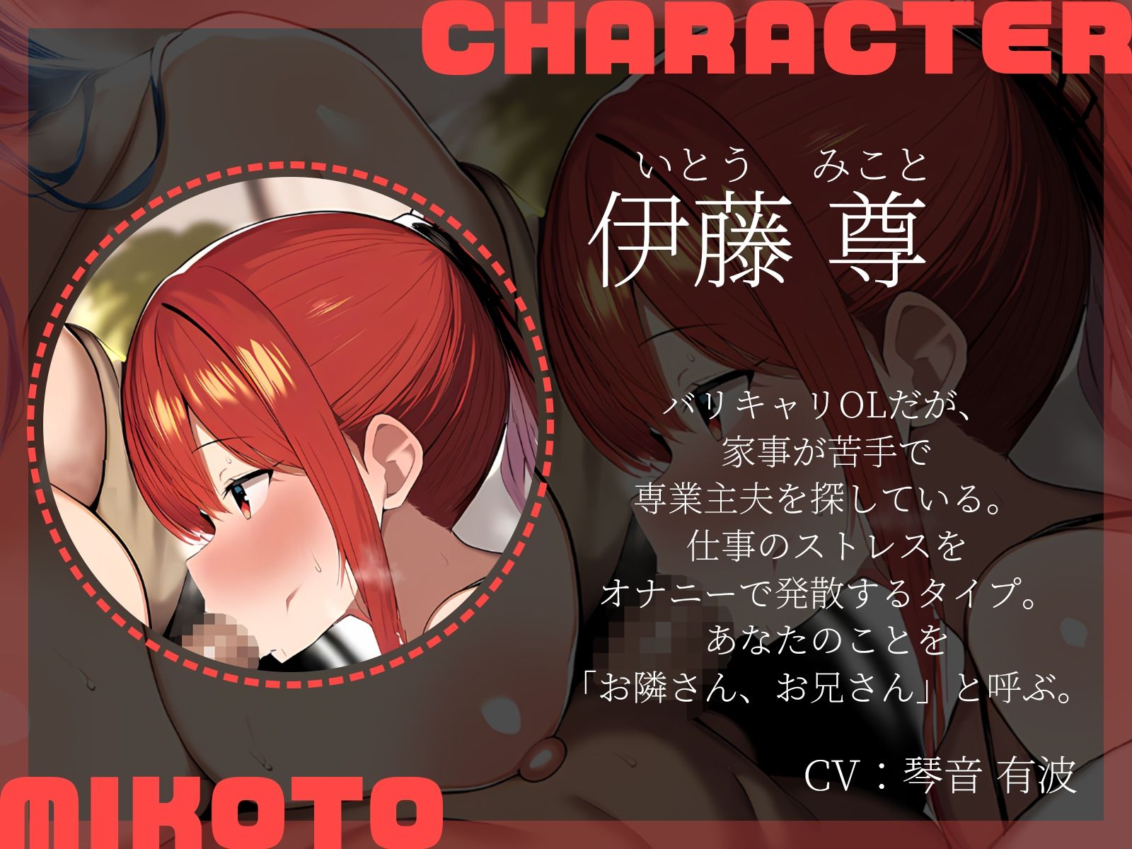仕事のストレスをオナニーで発散するタイプ。あなたのことを「お隣さん、お兄さん」と呼ぶ。