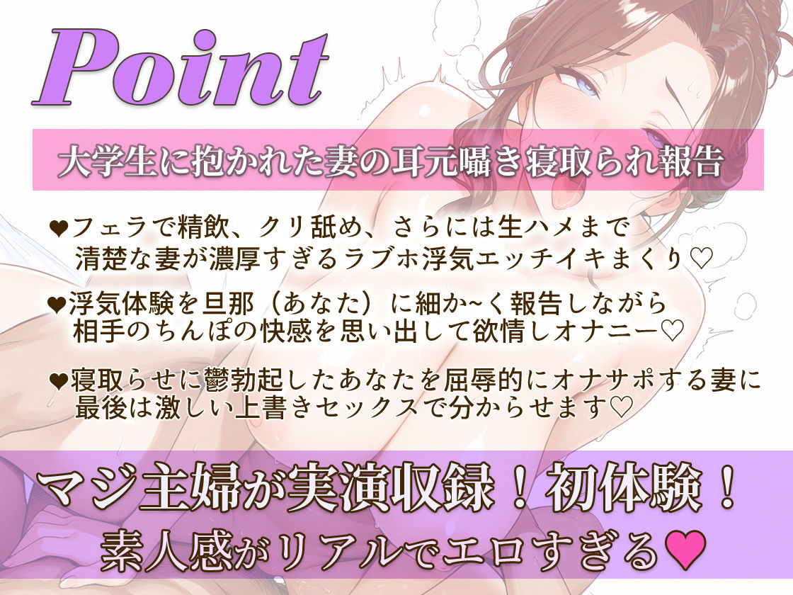 「あの時の彼のちんぽの感触、忘れられないわ…。もうすっかりおまんこに彼のちんぽの形、覚え込まされちゃったの……」セックスはしばらくご無沙汰、おしとやかな30代主婦の寝取られ。パート先の大学生とラブホへ行き、若い巨チンに突かれまくって大絶頂したことをオナニーしながら旦那であるあなたに報告。罪悪感が快感に変わり、Sに目覚めてしまって…?素人人妻の初実演収録がリアルでエロい!