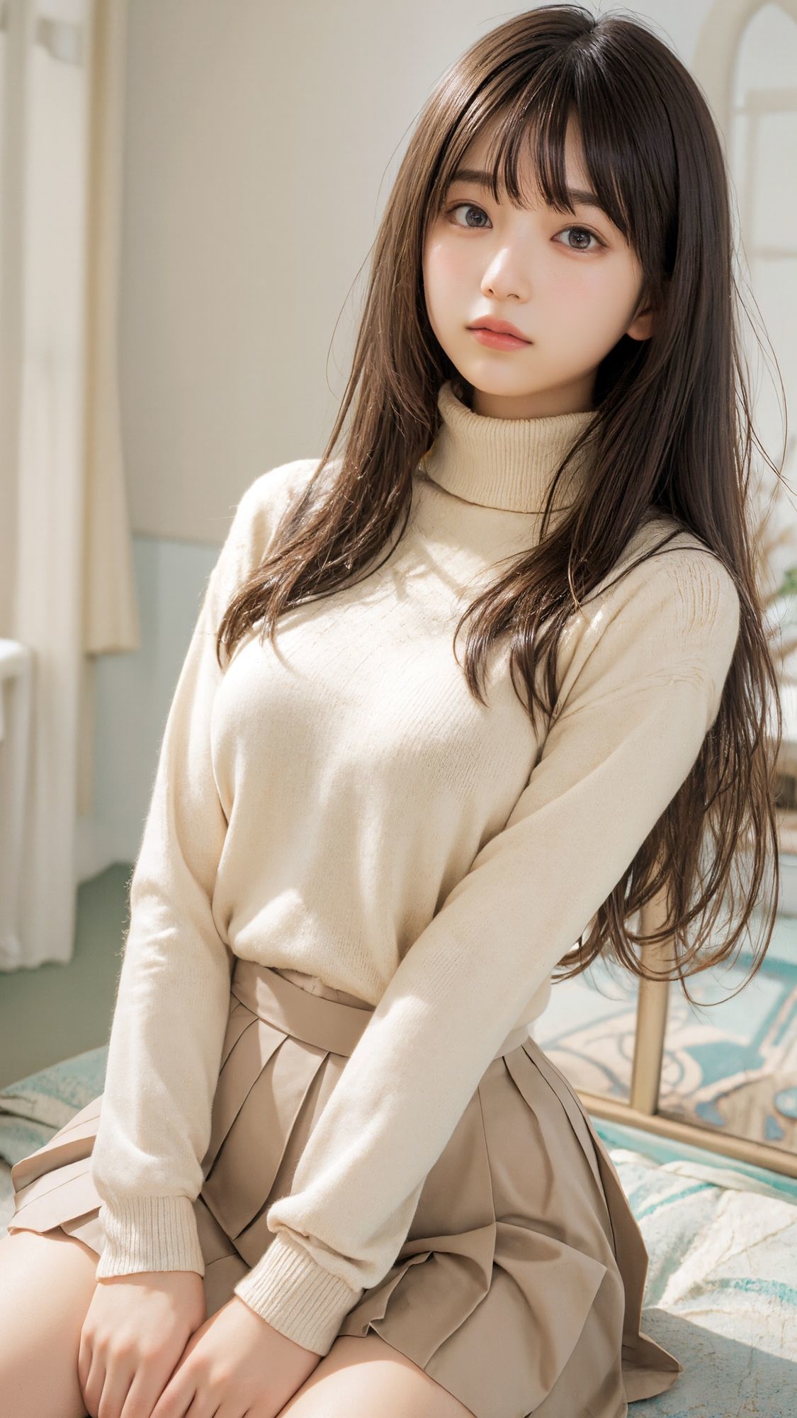 タートルネックのニット、ミニスカートをテーマにした12枚です。