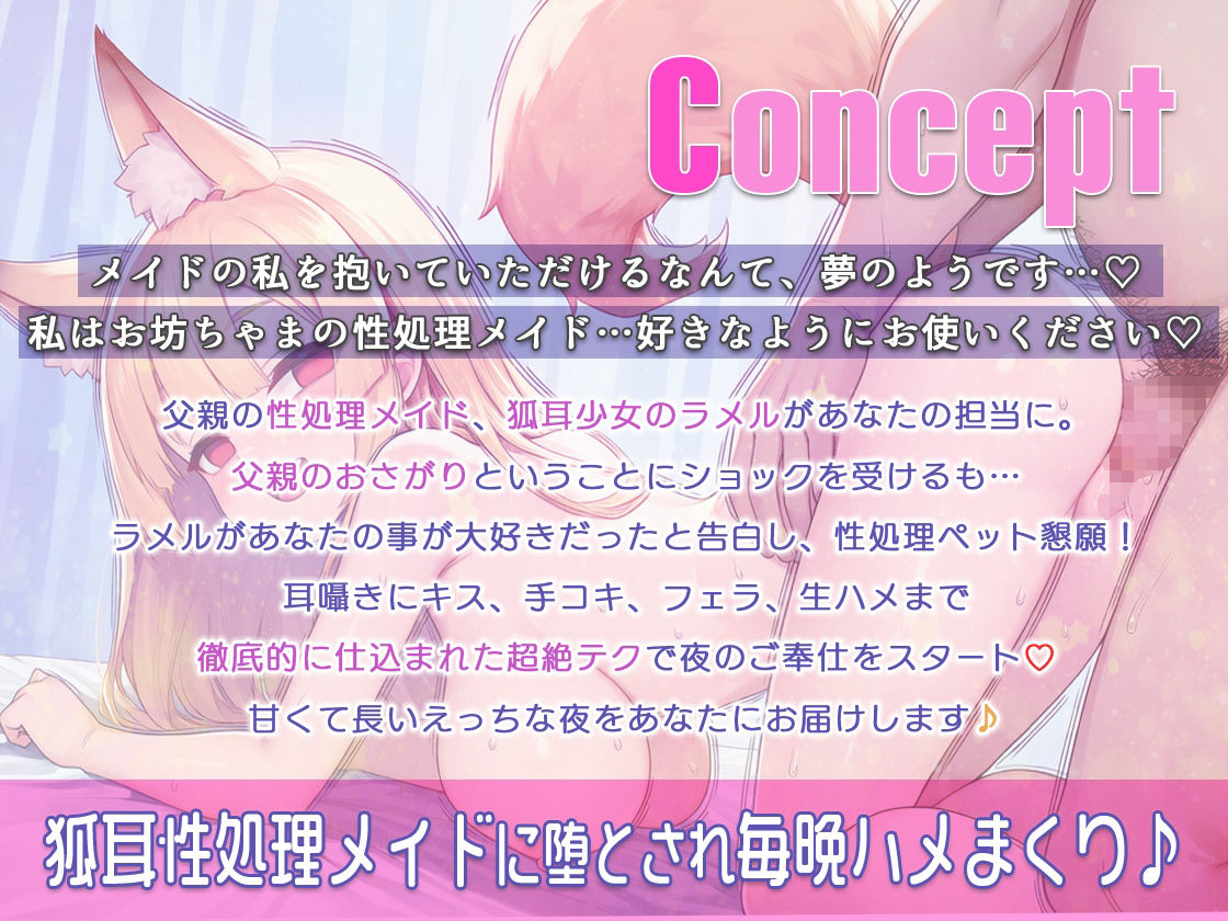 「私のような◯◯体でおちんちん勃起していただけるなんて…ええ、性処理は私にお任せください。そのためのメイドですから…」狐耳メイドのラメルがあなたの担当に。父親の性処理メイドだったことにショックだったが仕込み済みの超絶セックステクでどんなプレイも完璧にこなすラメルは耳囁きにキス、手コキ、フェラなど超絶テクであなたは、とろっとろ調教されて、毎夜あまラブセックスに浸り続けることに!