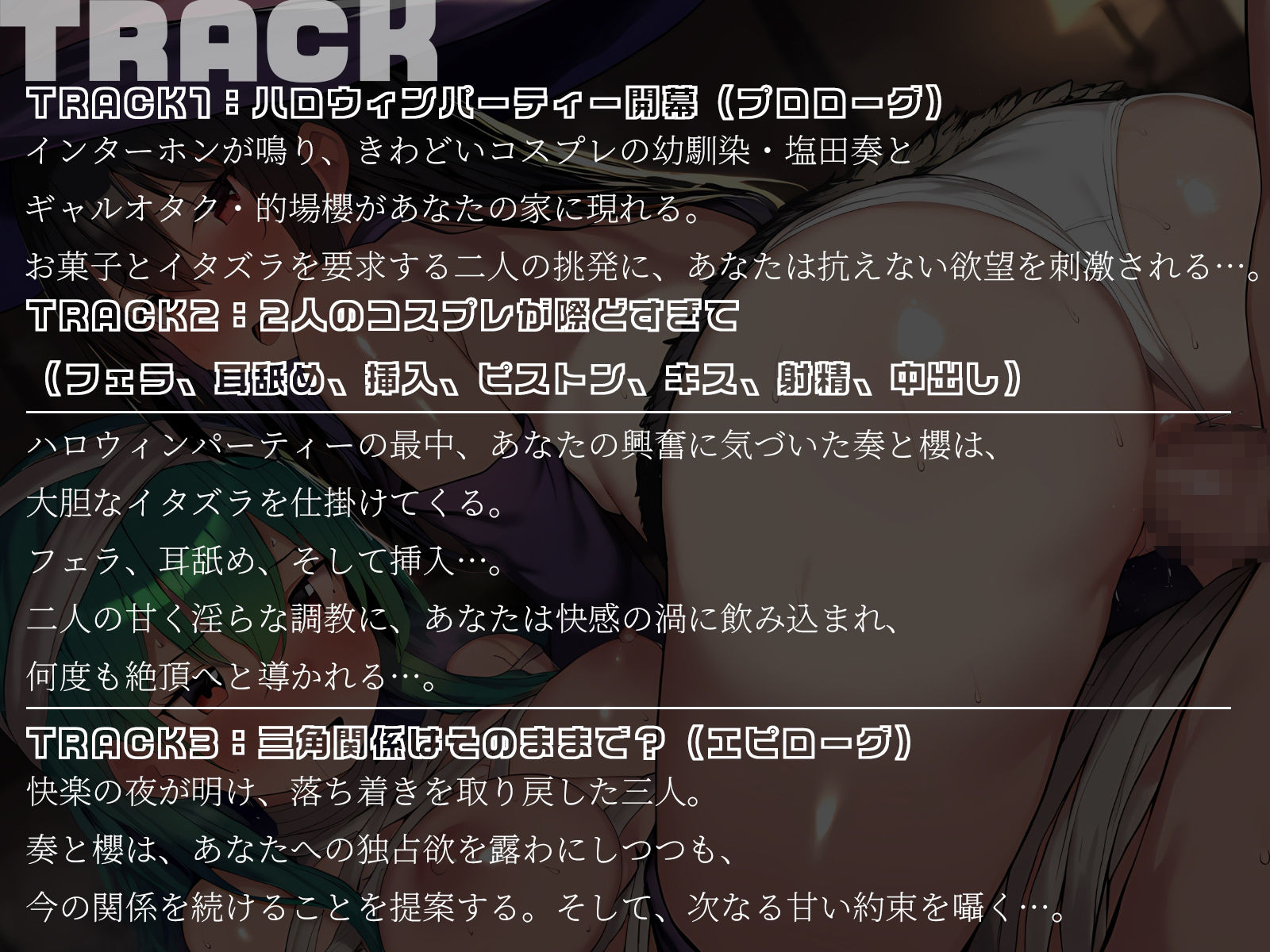 ハロウィンパーティーの最中、あなたの興奮に気づいた奏と櫻は、大胆なイタズラを仕掛けてくる。